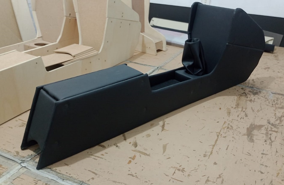 Modelo grande, que vai até o meio dos bancos, cobrindo o freio de mão